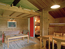 Die Häuser mit Dusche/WC, TV (schwedisch) und Kochnische (inkl. Geschirr, Besteck, Töpfe) sind einfach und zweckmäßig eingerichtet. Zwei Etagenbetten stehen in zwei kleinen Schlafräumen, die mit einem Vorhang vom Wohnraum getrennt sind. Zwei zusätzliche Matratzen befinden sich in der Empore. Tisch und Stühle sind natürlich vorhanden. Zusätzlich gibt es eine kleine Sitzecke mit Couch und Sesseln.